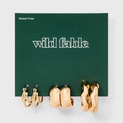 Wide and chunky twist trio earring set from Wild Fable™. Includes three pairs made of nickel-free metal in metallic gold-tone finishes. Two open-hoop pairs with wide chunky and twist designs and one pair featuring a pattern of three rings fanning out. Clip-in clasps and post-back closures provide a snug, customizable fit.