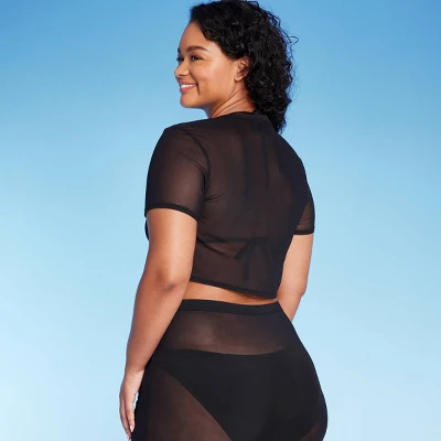 Stylish sheer mesh cover-up top from Wild Fable™ with cap sleeves. Features a just-above-the-waist length and ruched front with tie detail. Made with recycled polyester fabric with spandex for comfort and breathability.