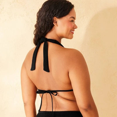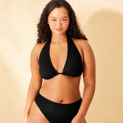 Multi-way triangle bikini top from Wild Fable™ with pucker texture. Made from recycled polyester knit fabric with spandex and partial recycled polyester lining. Removable cups and adjustable back and behind-neck ties offer customizable wear. Opaque sheerness provides confident coverage.