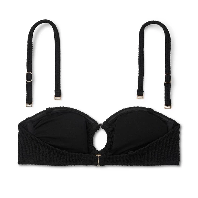 Bandeau bikini top from Wild Fable™ with allover ribbed texture. Made from recycled polyester with spandex and partial lining for stretchy comfort. Removable cups and removable, adjustable straps provide customizable coverage and fit. Stylish O-ring detail at the center of the bust finishes off the look.